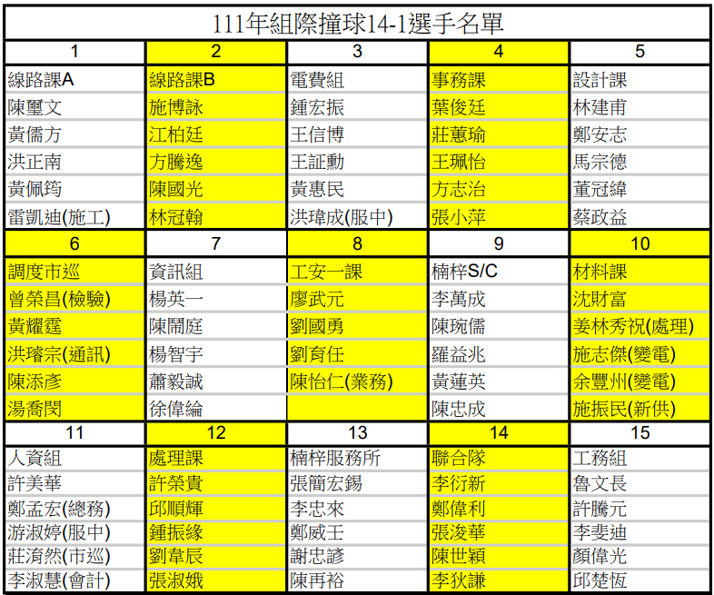 2022 年 6 月 13 日 | 尚無留言 111年組際撞球14-1選手名單 一、比賽時間:111年6月 19 日(星期日) 09:00~15:00 二、比賽地點:本處調度大樓五樓撞球場。 111年組際選手名單 註:每隊需至少參與一場比賽,方可領取參加獎 六、比賽規則: 1.採14-1,不指定球亦不指定袋(可開球前雙方協調採指定球指定袋),打進每球得一分,犯規扣一分母球自由球,先取得10分者勝。 2.採五戰三勝制。 3.抽籤決定賽程,預計6/15(星期三)12:00在福利會進行抽籤,未到場 隊伍由主辦方代抽。