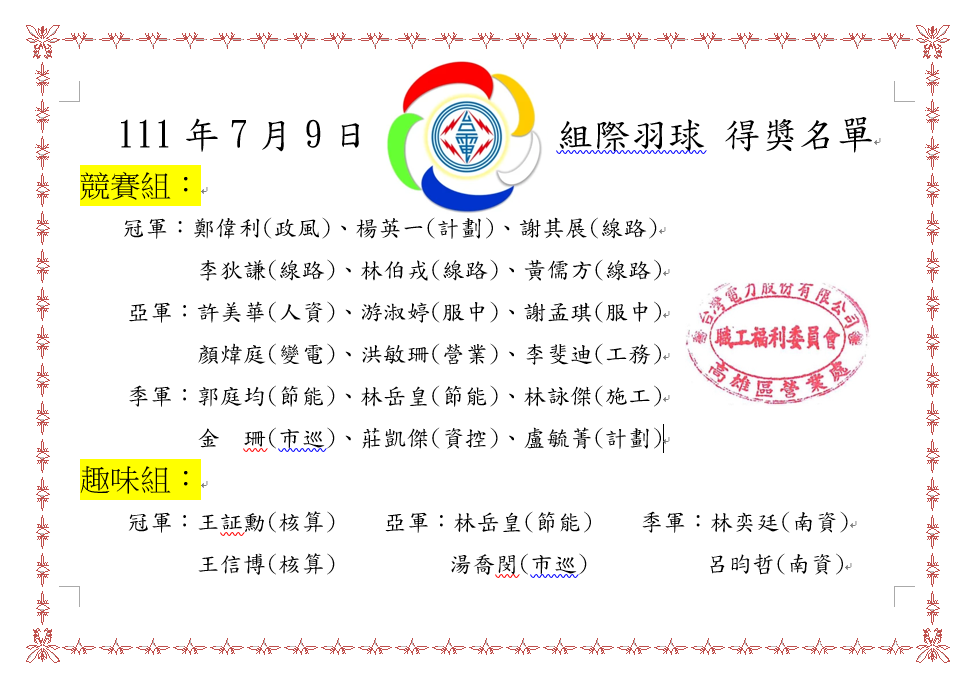5. 「劉文斌」於〈台電高雄區營業處職工福利委員會111年員工象棋(暗棋)比賽活動〉發佈留言