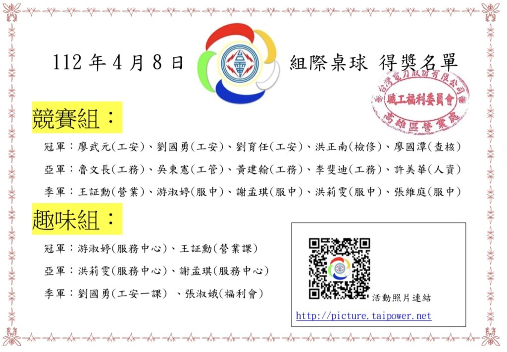 4. 「Li DC」於〈台電高雄區營業處職工福利委員會111年員工象棋(暗棋)比賽活動〉發佈留言