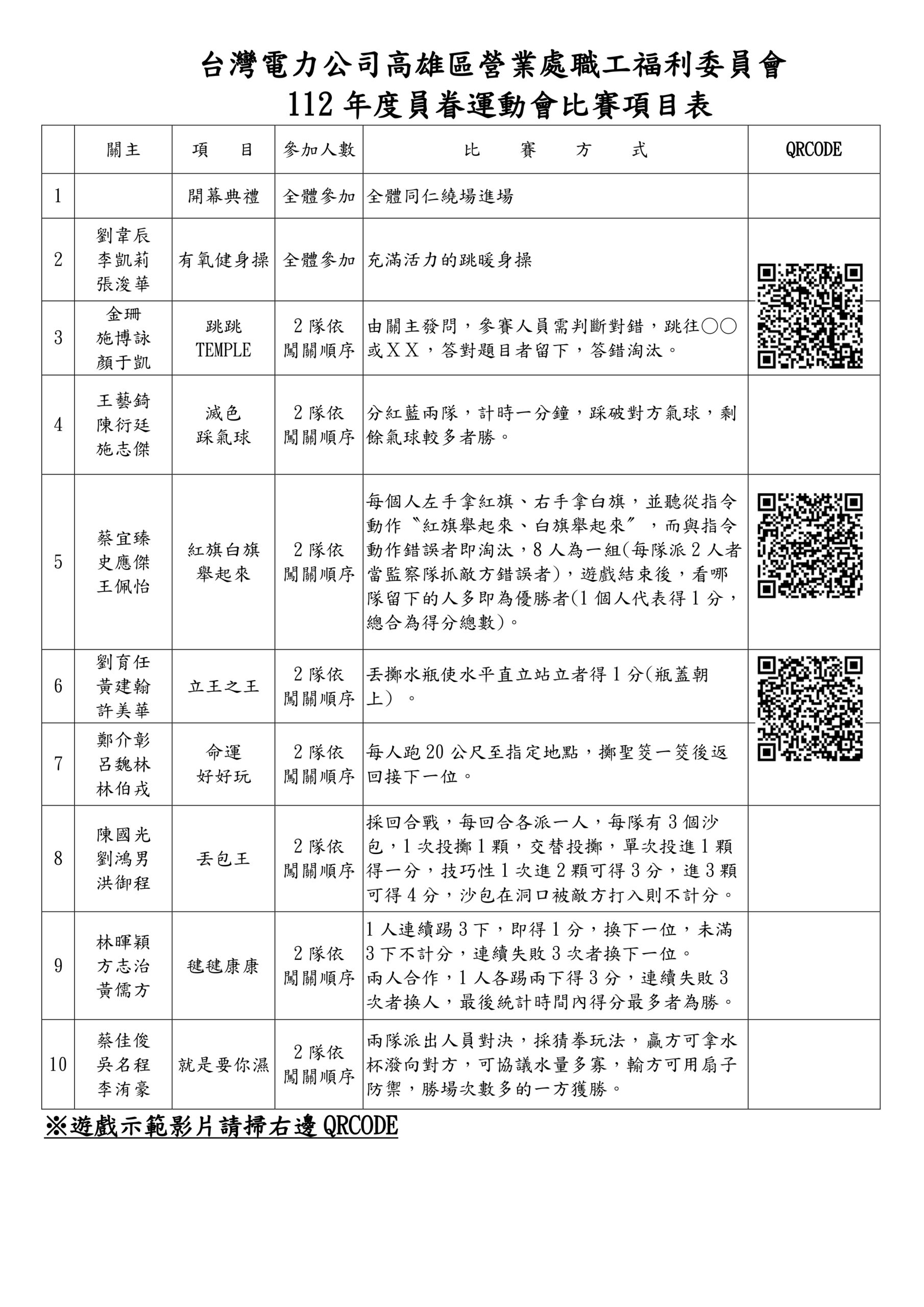 | 關主 | 項 目 | 參加人數 | 比 賽 方 式 | QRCODE | |
